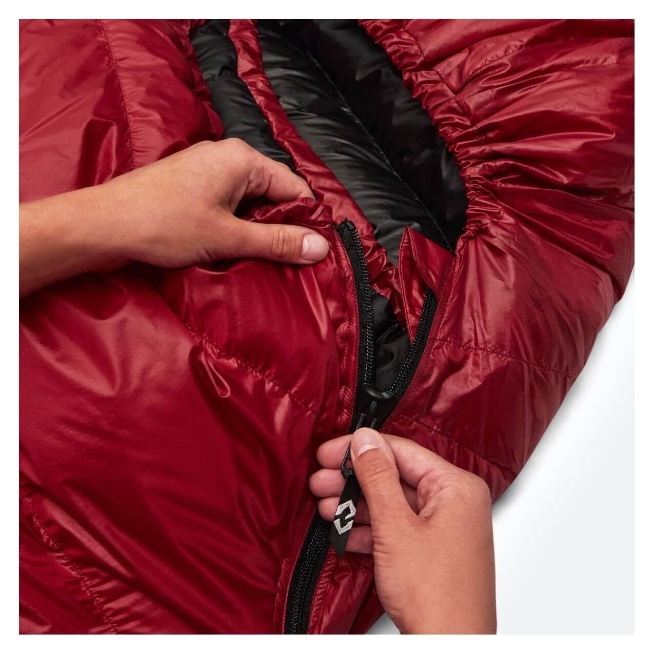 A major asset is also the sleeping bag’s construction: trapezoid chambers, a shark-fin foot box and a new, ergonomic design of the hood providing unique comfort. Additionally, we have added draw cords and tapes to the hood making it more adjustable. It is also equipped with an independent, adjustable elastic collar with velcro fastening.