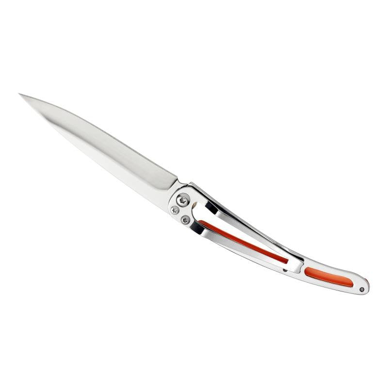 Deejo color 27g - the world’s lightest knife. Brightly remarkable and eye-catching orange colour to help you spot your deejo anywhere. Light as feather with a blade as sharp as ever. Ultra-light knife in 420 stainless steel, mirror finish. Secure liner lock system. Translucent polycarbonate handle slab (in white). Belt clip. Delivered in a gift box.