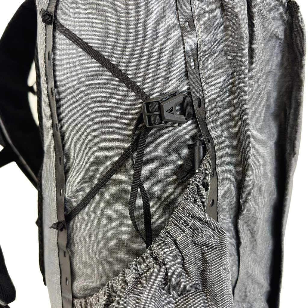 | Advanced Side Compression | Laser cut daisy chain system with a versatile dual strap closure is highly customizable to fit anything including ice axes and trekking poles. |