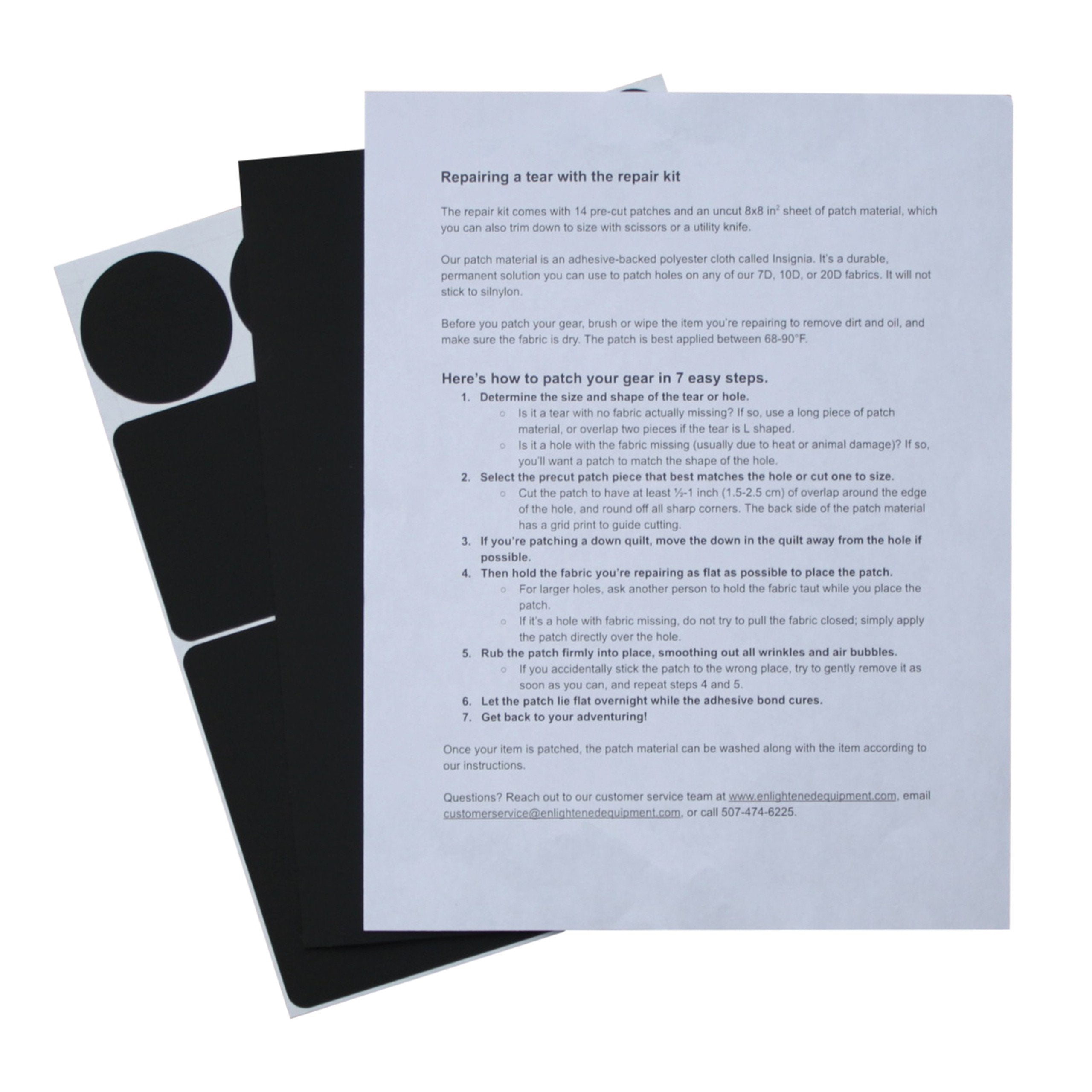 - Kit includes 14 pre-cut pieces, and an uncut 8 inch x 10 inch sheet of patch material, along with instructions for patching your gear
