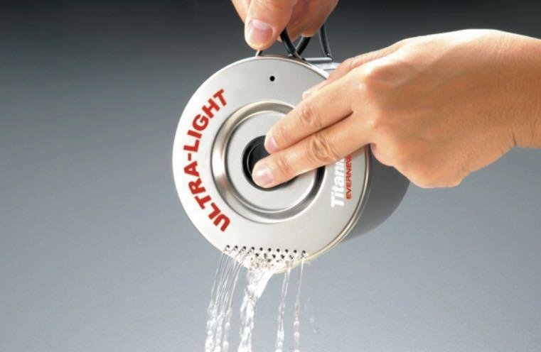 EVERNEW Ti Pasta Pot 1000ml - ultralight titanium pot with volume 1000 ml. Has unique lid to help you drain water from whatever you may be cooking which is also a very neat addition. Not only used for Pasta cooking.