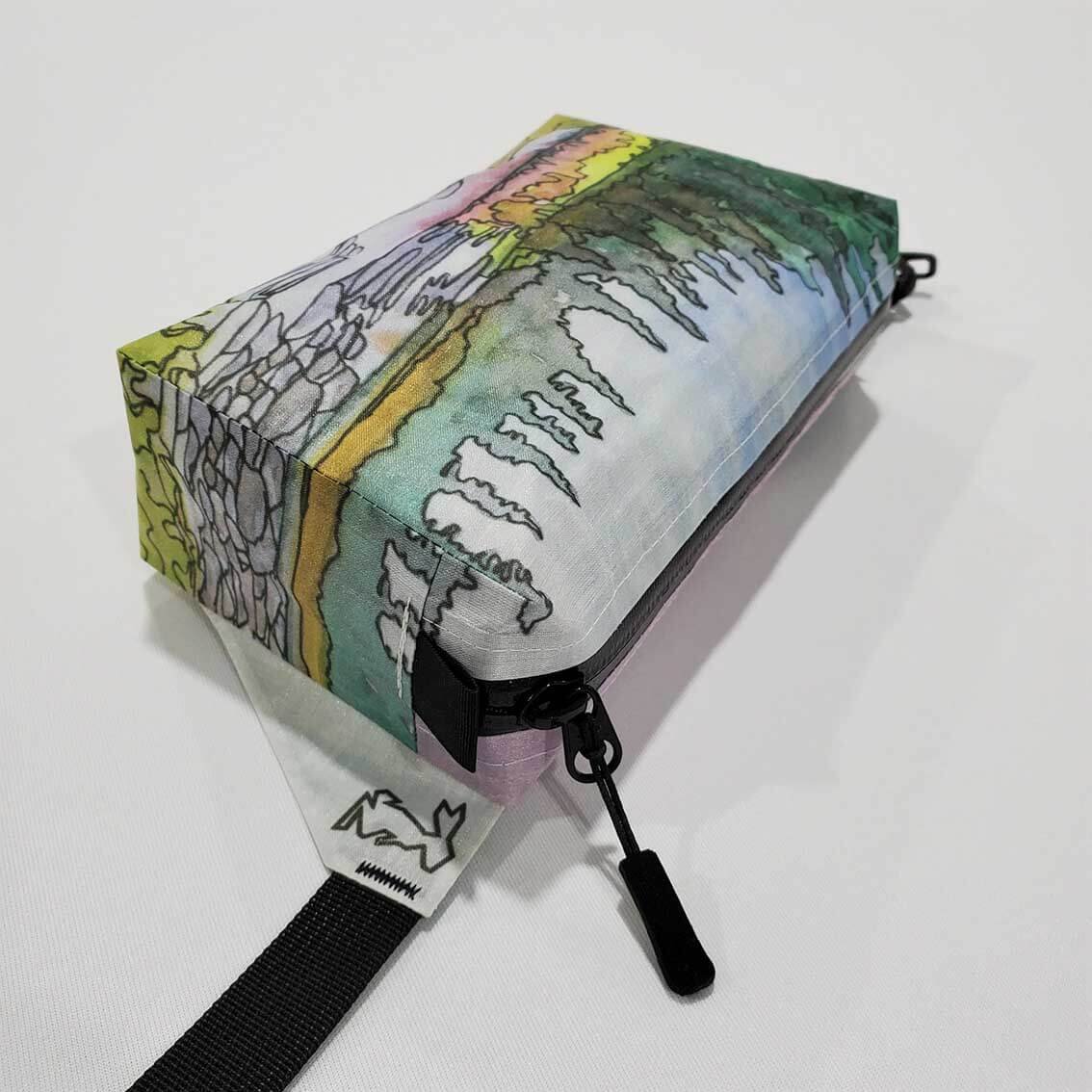 HIGH TAIL DESIGNS Ultralight Fanny Pack WATERCOLOR "Boulder Canyon" - is fully-taped near-waterproof and abrasion-resistant Dyneema Hybrid pack, weighing just 51 grams (1.8 oz) which feels like literally nothing and has a volume of just around 1 liter.