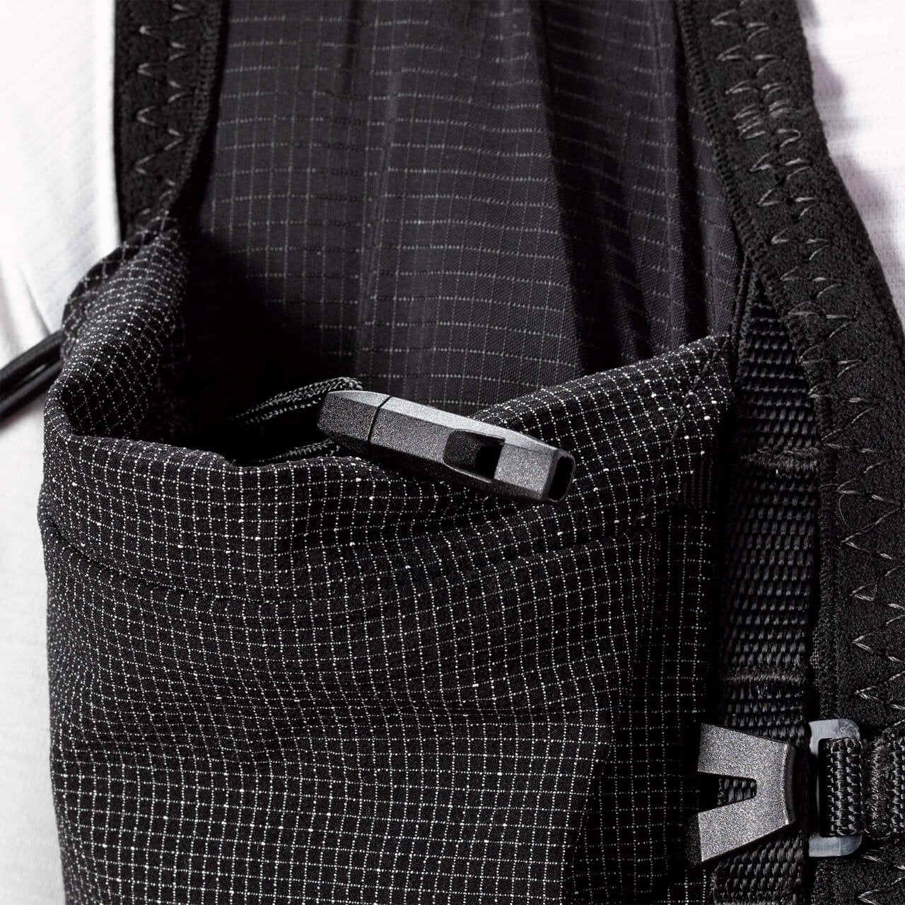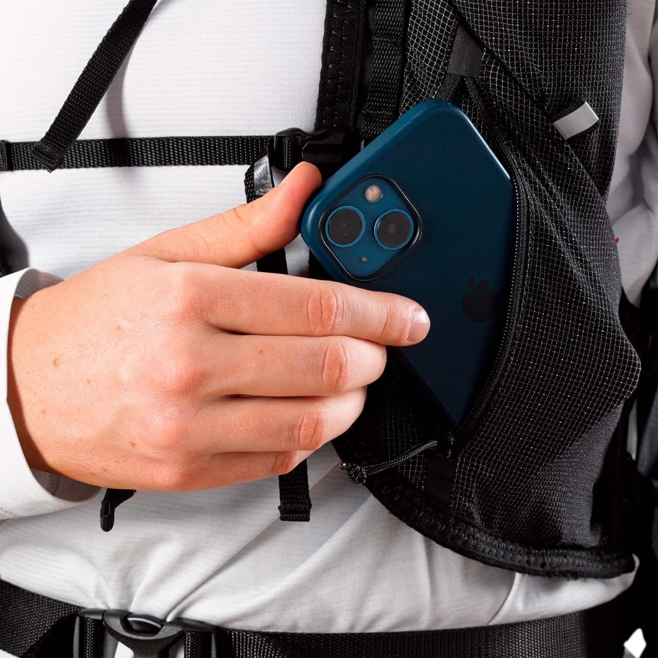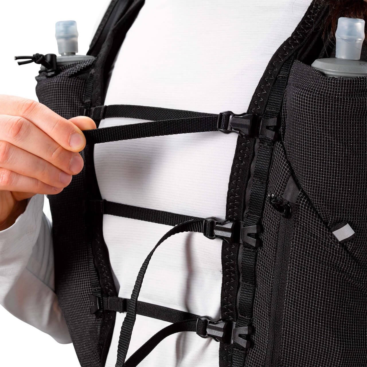 This pack features integrated shoulder and storage pockets, including two water bottle pockets, two snack pockets, and a zippered phone pocket on the vest straps. The roll-top closure with a single over-the-top compression strap and a large outer stretch mesh pocket provides ample storage, while Dyneema Grid Stop side pockets are angled for easy access and secure content retention. A bottom stretch mesh snack pocket with a trash port adds convenience on the move.