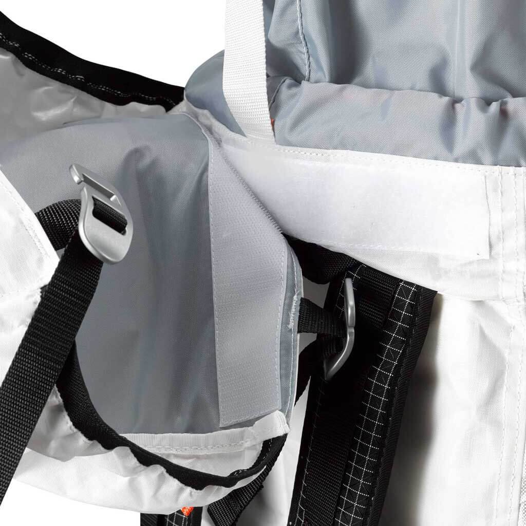 All previously made HMG packs have roll-top closure systems to save weight. The Prism is their first pack with traditional brain built for quick access to headlamp, extra gloves, energy bar any other things. Beneath the removable brain is a gray collar with two drawstring closures easily adjustable even with thick gloves.