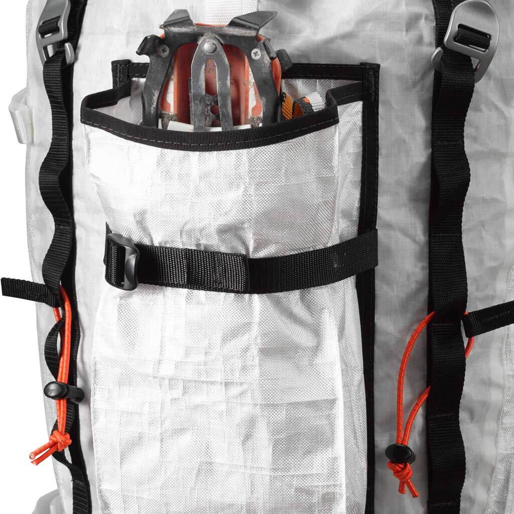 Climbers can store a rope under the lid, glacier adventurers can store their wands in the side pockets, and backcountry skiers can depend on the A-frame carry when they’re on foot marching up the steep stuff. Alpinists of all types can round out the pack with the Prism Crampon Bag and Prism Ice Screw Case for an even more dialed setup.