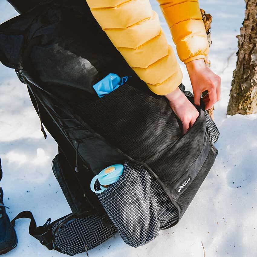 | Front External Pockets: | Large dual-entry front pocket provides significant storage as well as streamlined access to smaller items (i.e. tent stakes) without the need to dig/empty the pocket fully. Made from an extremely durable Dyneema® Stretch Mesh |