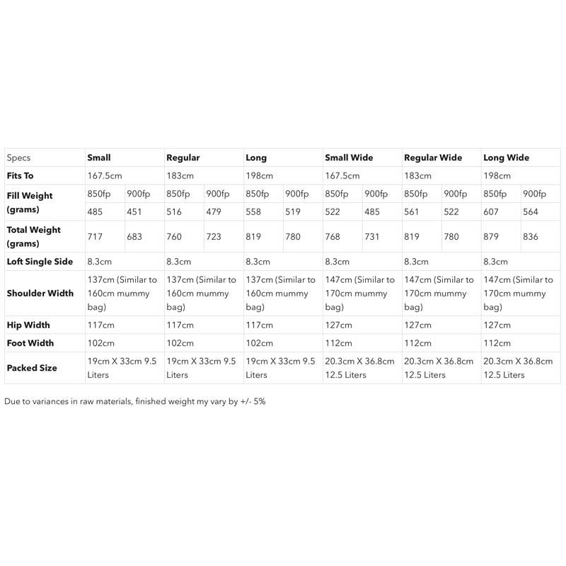 - Differential Cut – A critical factor in quilt style bags with adjustable girth, differential cut allows for maximum loft from our premium goose down.
