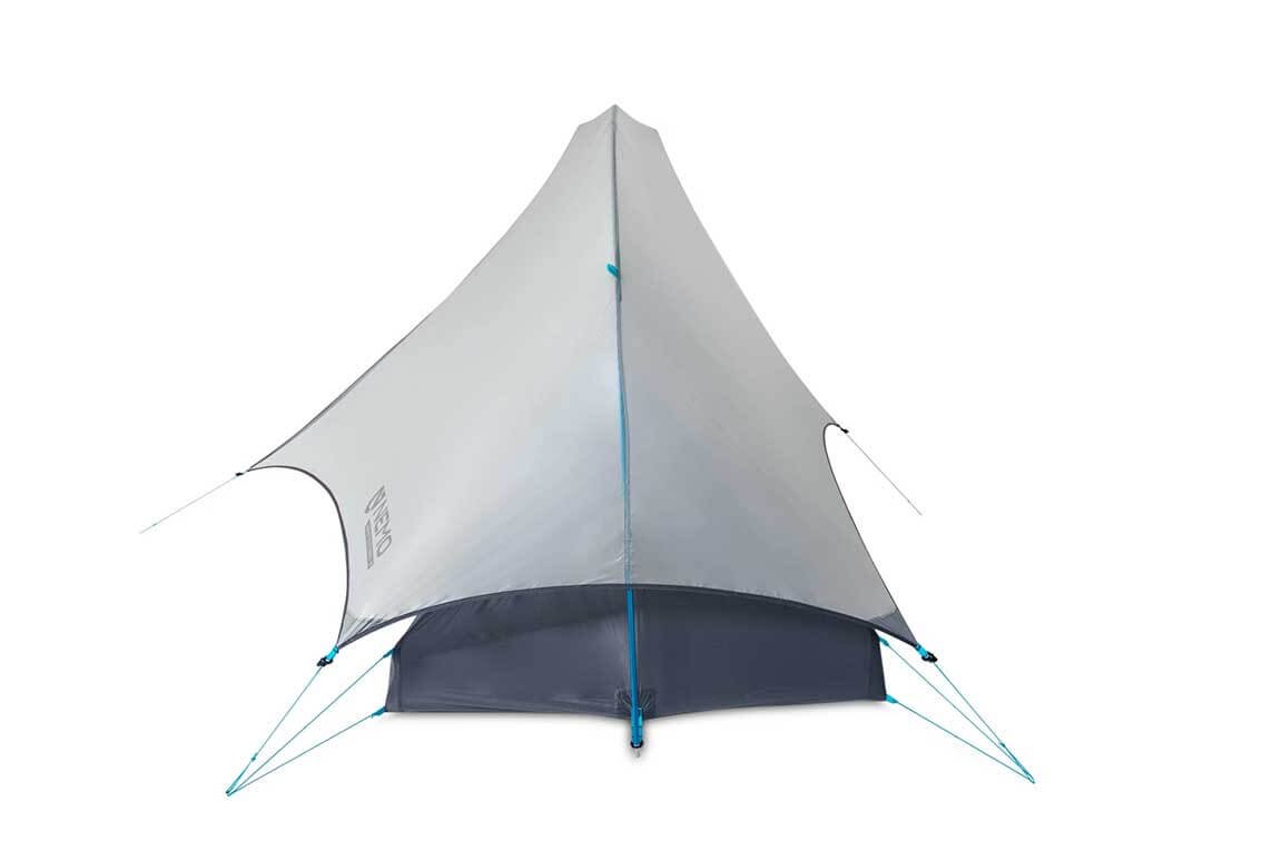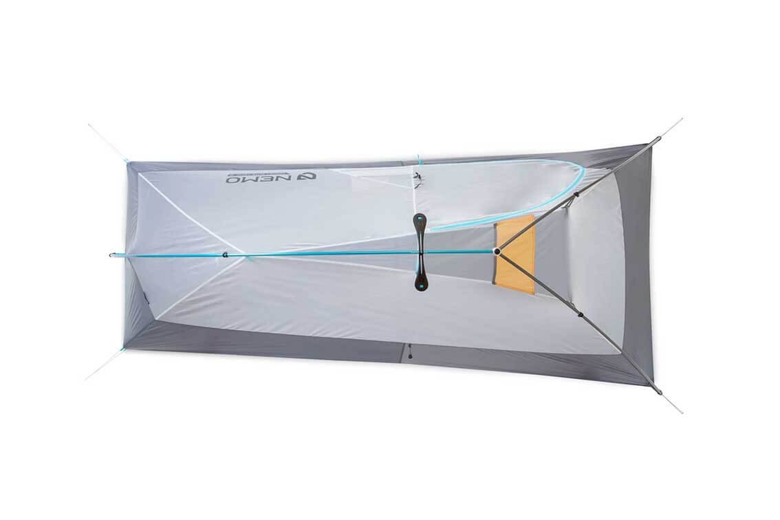 Patent-pending Flybar™ volumizing pole clip increases interior headroom by widening the canopy at the peak without adding unnecessary grams. Its unique shape and flexible composition also distributes fly tension evenly to eliminate any stress points.