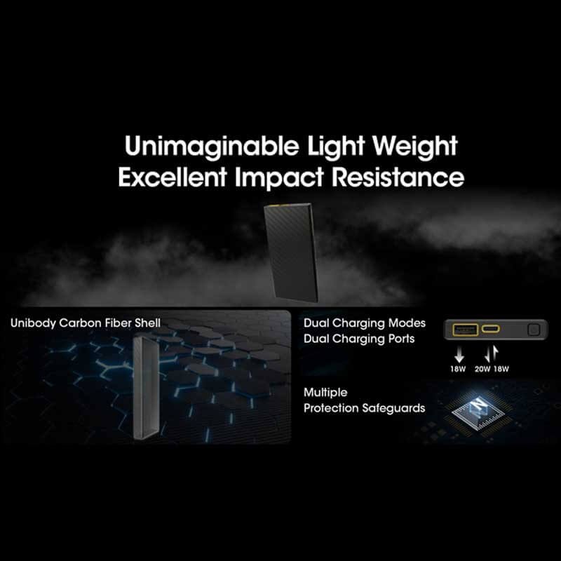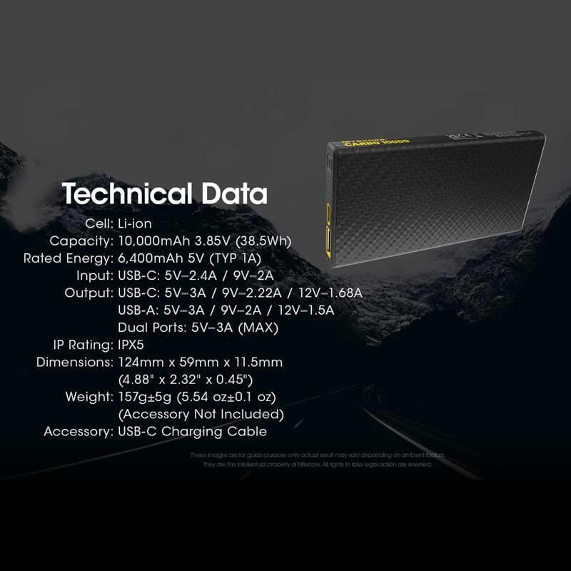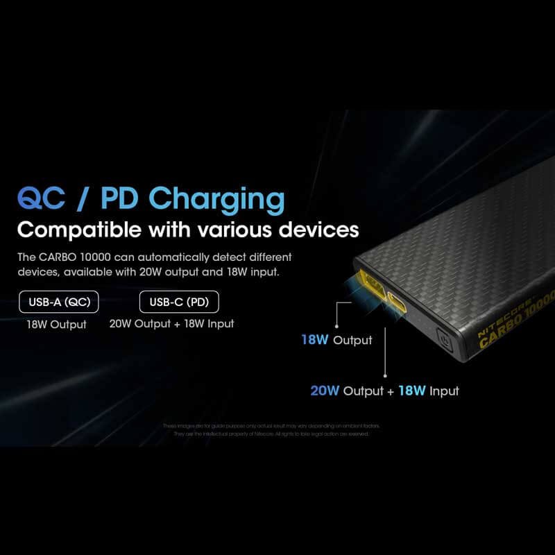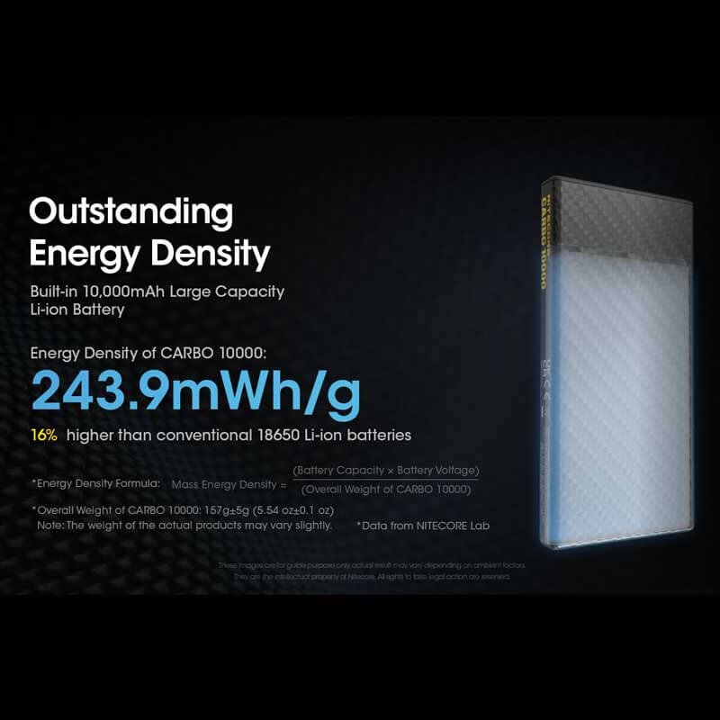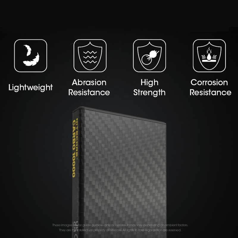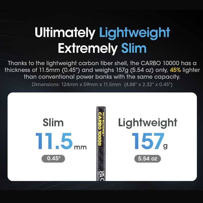 Nitecore CARBO 10000 - is a lightweight high capacity 10000mAh power bank designed for everyday use anywhere. It weighs only 5.54 ounces, lighter than a typical phone, yet it still has enough power to charge the latest phone two times over!