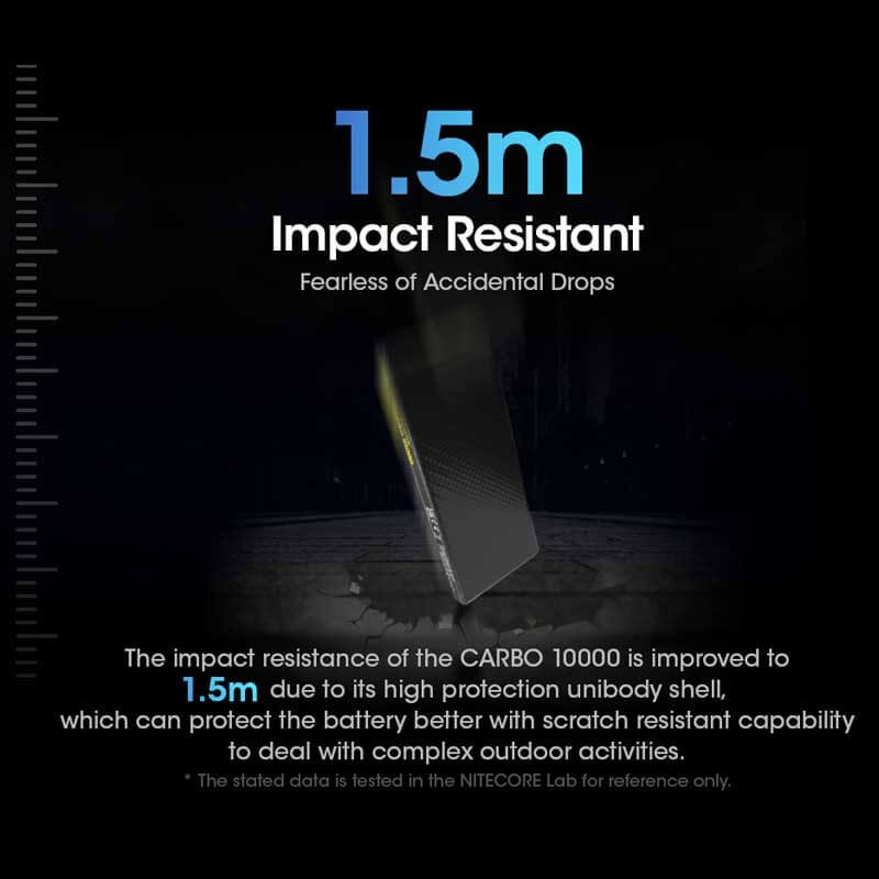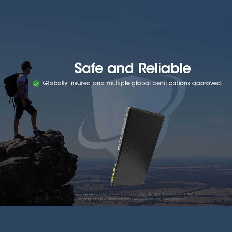 Traveling? The Carbo 10000 is approved for airline travel in accordance with UN38.3 protocols. Going outdoors? The lightweight yet strong carbon fiber case ensures that Carbo 10000 is highly resistant to puncture, abrasion, and drop up to 1.5 meter. Additionally, the Carbo 10000 is IPX5 rated water resistant, and provides safeguards against short-circuit, overcharge, over-discharge, and overheat, making it an excellent companion to Nitecore's portable solar panels and an essential for emergency kits.