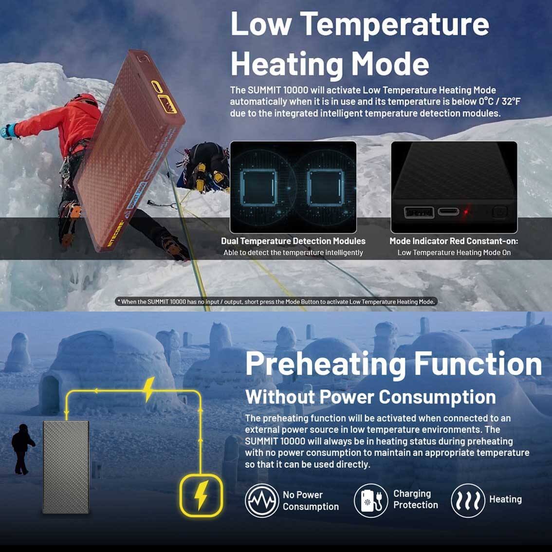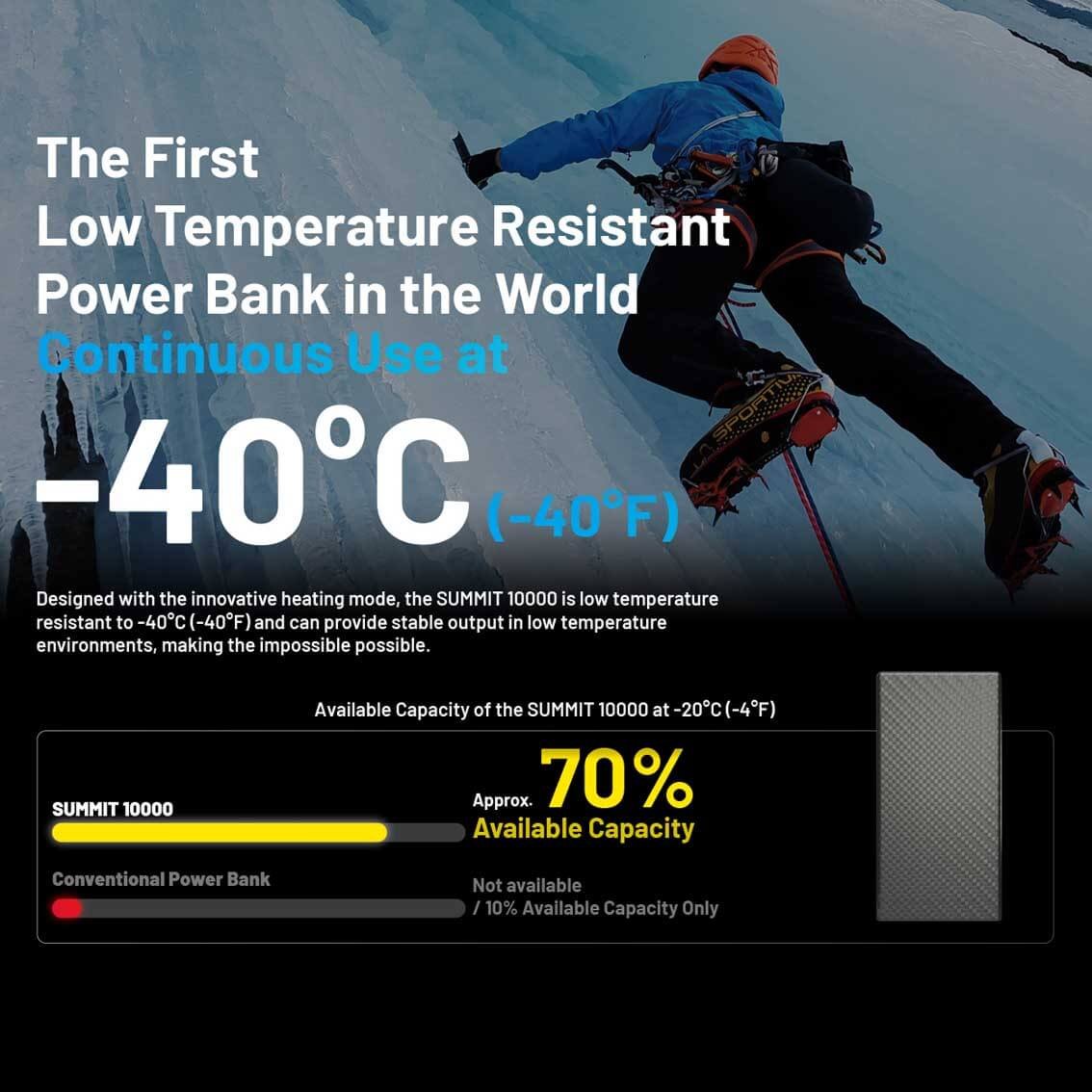 NITECORE SUMMIT 10000 - is the first low temperature resistant power bank in the world. Designed with the innovative heating mode, the SUMMIT 10000 is low temperature resistant to -40°C (-40°F) and can provide stable output in low temperature environments, making the impossible possible.