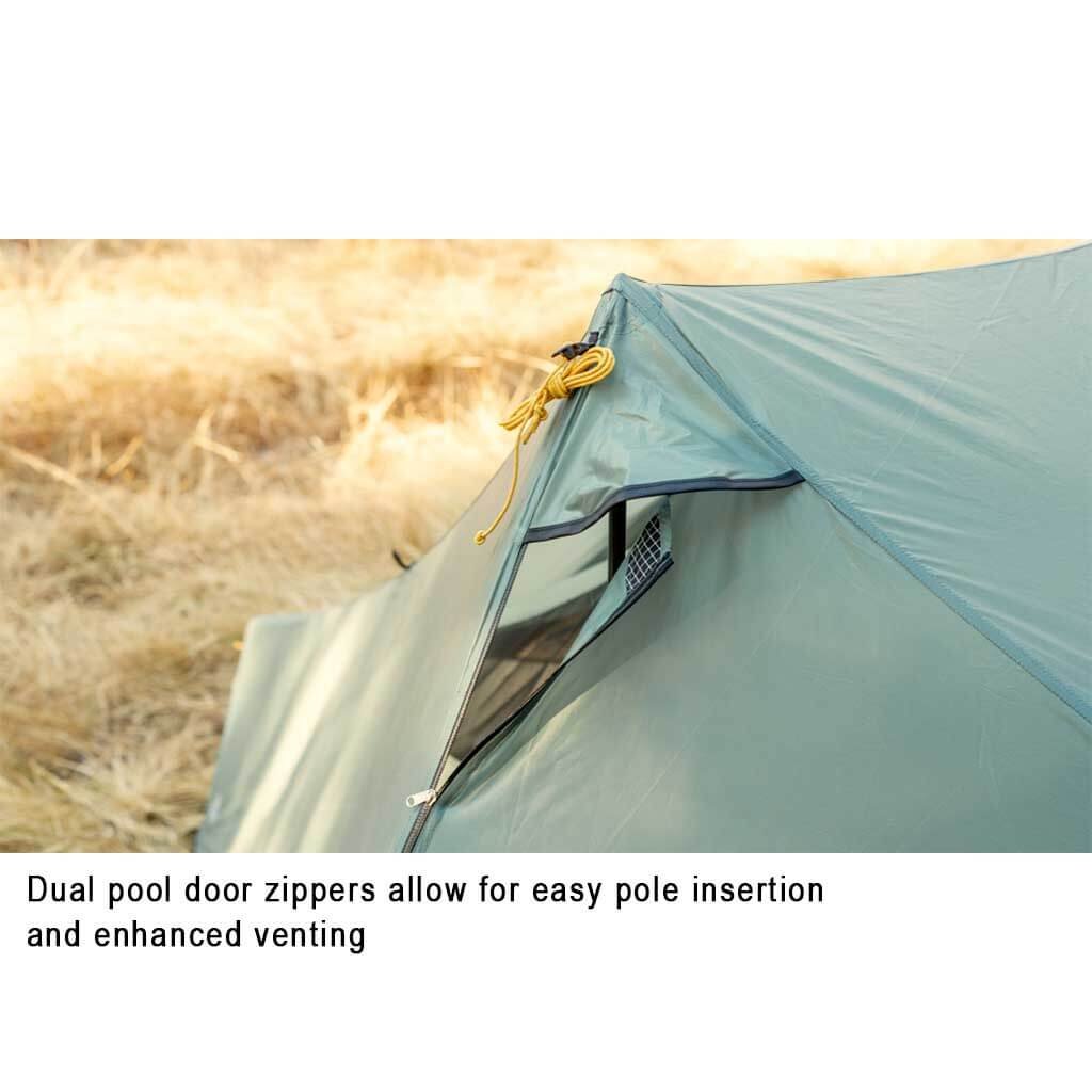 - Designed with trekking poles that can be positioned tip-up or handle-up using optional adapters, and a double-wall design that prevents condensation.