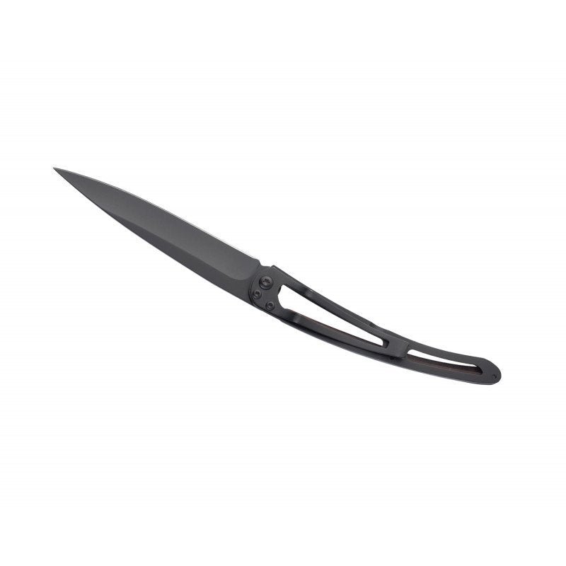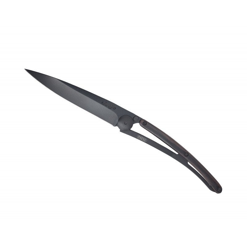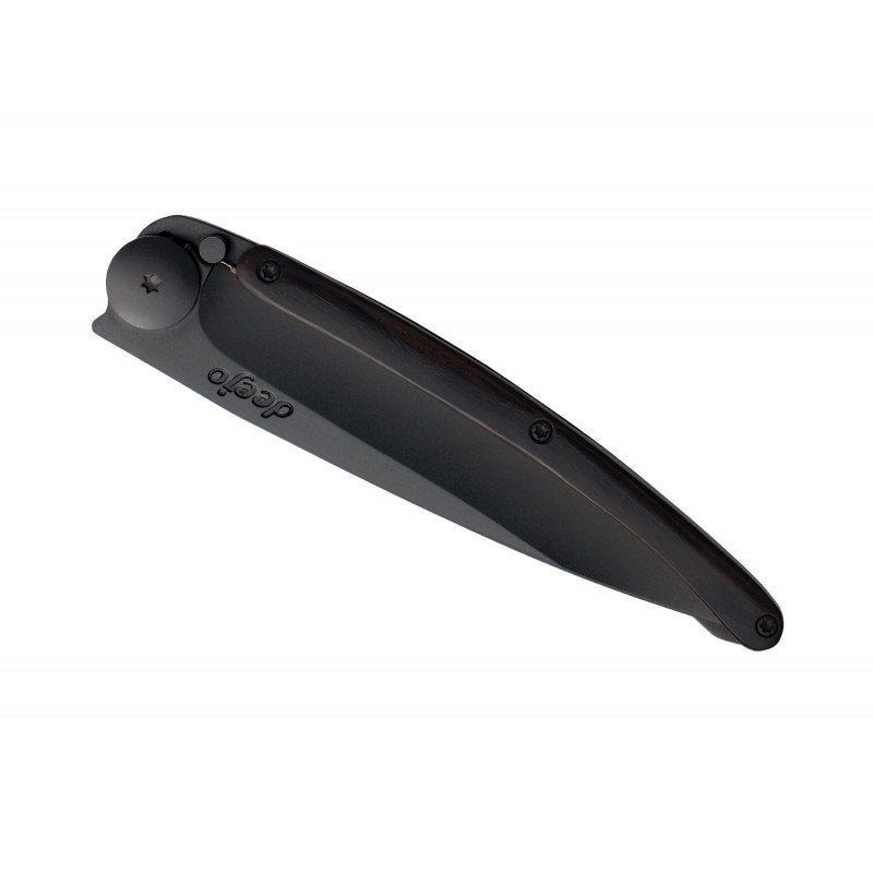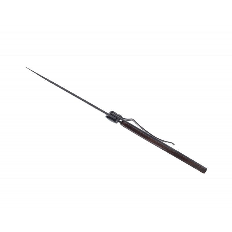 Celý v čiernom. Sýto čierne grenadilové drevo jemne splýva s matnými čiernymi odtieňmi titánového povrchu noža. Ultraľahký vreckový nôž z nerezovej ocele 420 s čiernym titánovým matným povrchom. Čepeľ noža so špeciálnym systémom uzamykania “liner lock”. Spona na opasok. Rukoväť nožíka je zdobená exotickým grenadilovým drevom.