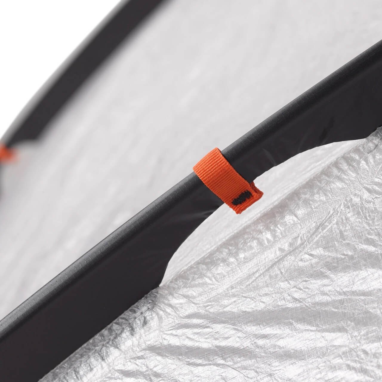 The tent’s structure is stabilized by external pole sleeves made from 20D sil-nylon, which enhance rigidity and wind resistance. These sleeves hold the pole system in place along the outside of the canopy, contributing to a freestanding pitch that doesn’t require staking for basic setup. Peak vents located near the top of the canopy further assist with moisture management by allowing rising condensation to escape. Magnetic toggles secure the doors when open, while reflective markings on the pole segments make setup and orientation easier in low light or nighttime conditions. The bathtub-style floor, with raised edges, helps block splashing or running water during heavy rain, and the entire shelter is seam-taped for additional protection against moisture ingress.
