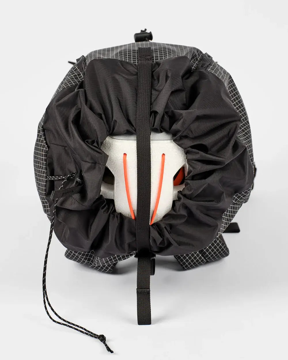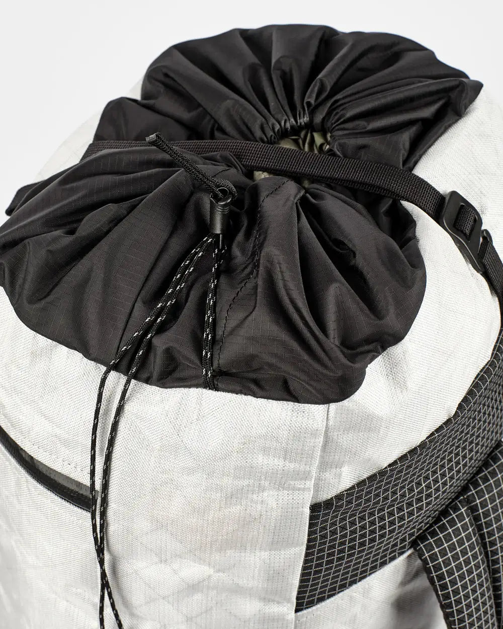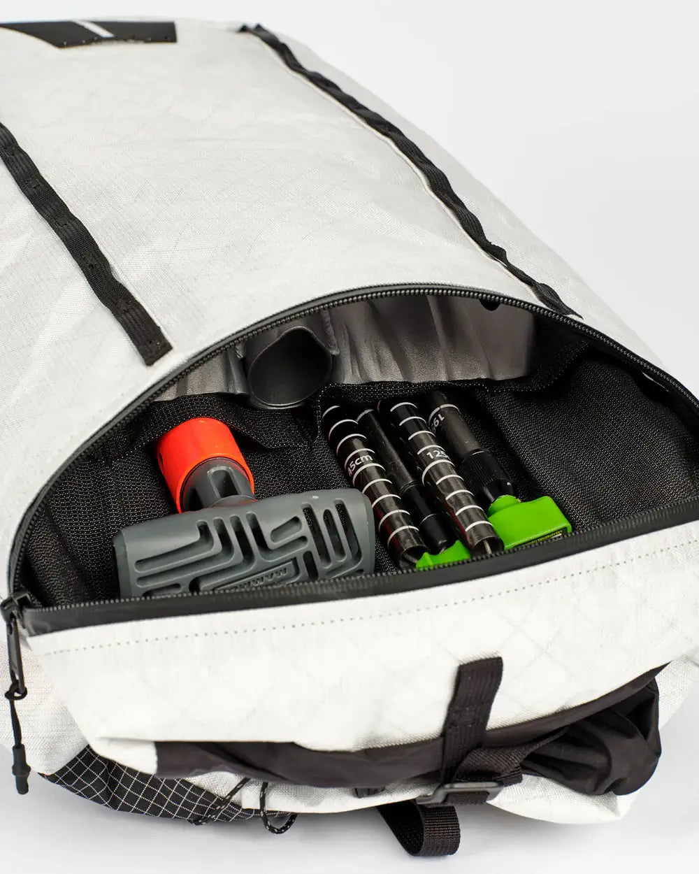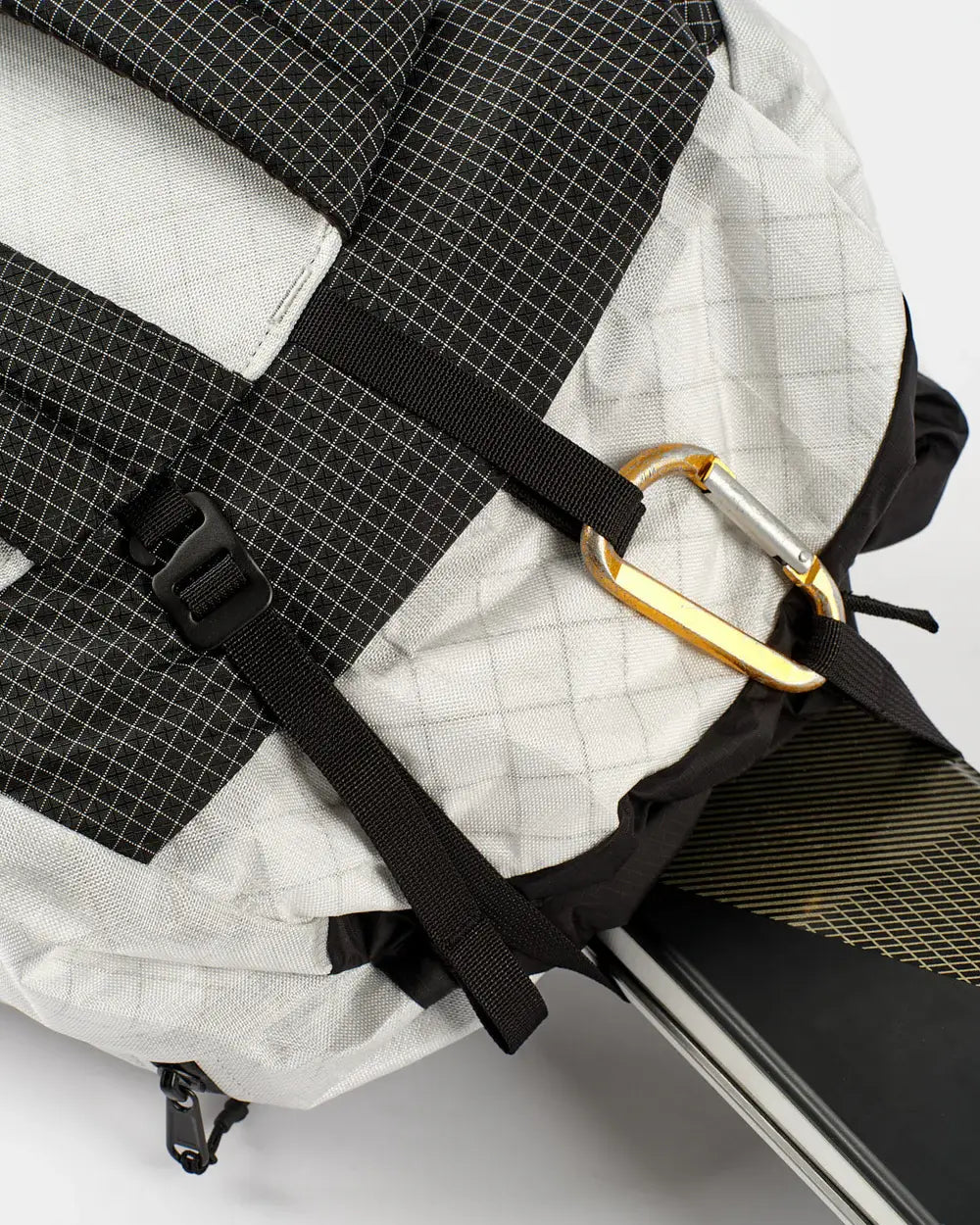 Batoh je vyrobený z odolných materiálov. Na výber sú dve varianty: čierny 210d UHMWPE Gridstop s hydrofóbnou karbonátovou vrstvou a biely Ultraweave 400TX, ktorý ponúka vyššiu odolnosť voči oderu a lepšiu vodoodpudivosť. Odnímateľný penový chrbtový panel dodáva batohu oporu bez zníženia flexibility a jediná veľkosť s dĺžkou trupu 46 cm zabezpečuje vyvážené a stabilné nosenie. Medzi hlavné funkcie patrí zipsom uzatvárateľné vrecko na lavínové vybavenie, vnútorné členenie hlavnej komory a uzatváranie pomocou sťahovacej šnúrky. Súčasťou je aj skrývateľný bedrový popruh, pričom batoh zámerne neobsahuje klasické vrecká na ramenných popruhoch pre čistejší profil.