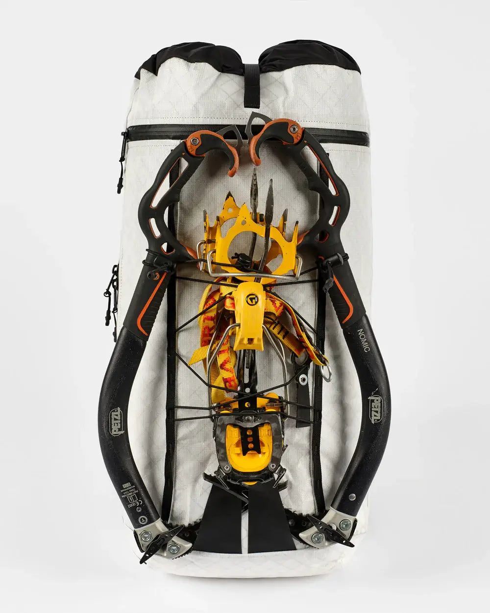 Konfigurácie nosenia lyží a lezeckého výstroja sa dajú prispôsobiť rôznym účelom. Batoh podporuje nosenie lyží v A-tvare aj diagonálne nosenie lyží (s použitím vlastných popruhov), dva úchyty na cepíny, úložný priestor na mačky pomocou centrálneho elastického lanka a možnosť uchytenia lana na vrchu batoha. Hoci nemá špecializovaný systém na nosenie prilby, kompaktné prilby sa zmestia dovnútra batohu alebo sa dajú upevniť zvonka pomocou existujúcich úchytných bodov. Dlhý bočný zips umožňuje prístup k výbave bez nutnosti skladať batoh, čo je ideálne rýchle skialpové túry, kde je efektivita kľúčová.