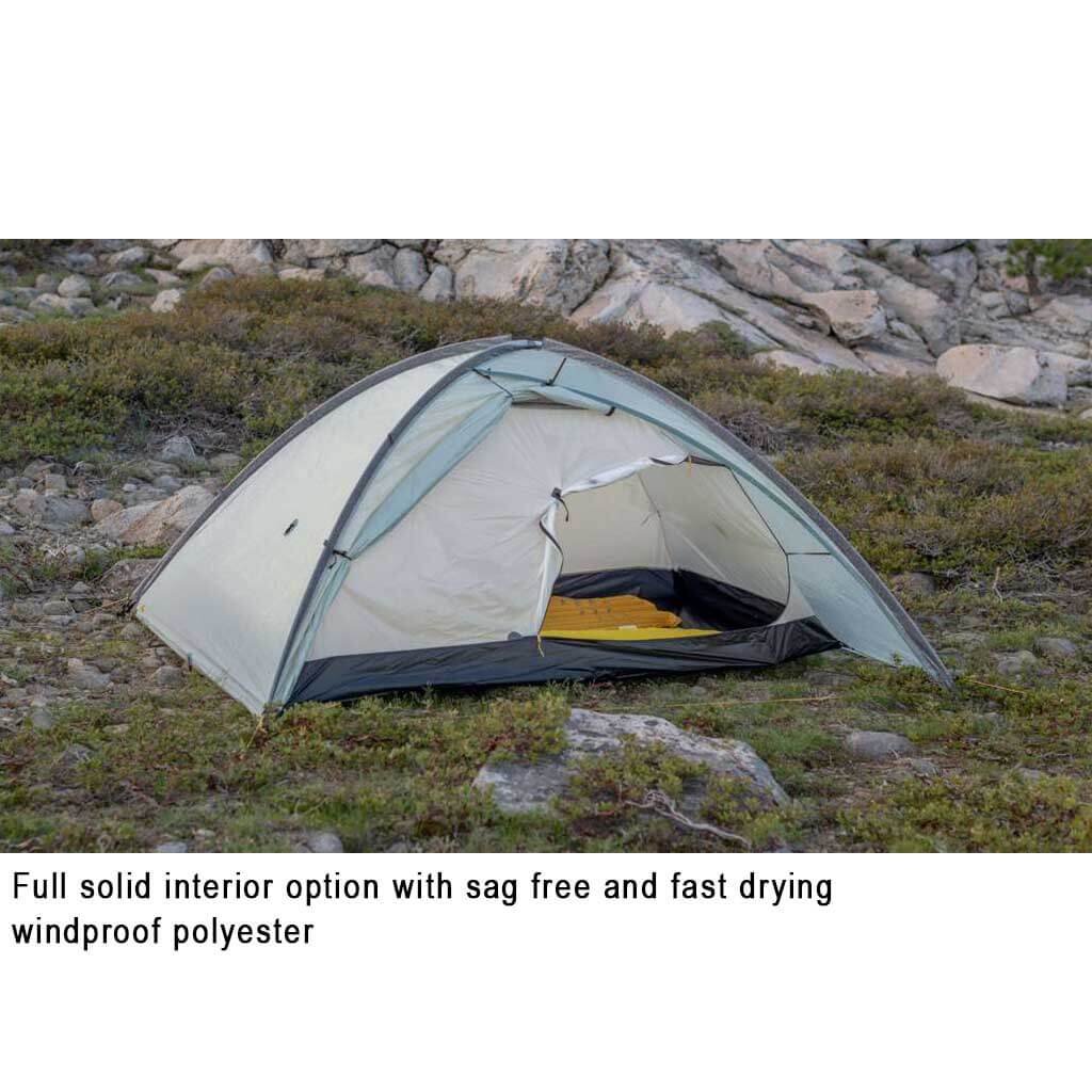 Sieťka: 15D nylon no-see-um sieťovina; Pevná látka: Priedušný, vetruodolný, rýchloschnúci 15D dvojitý ripstop polyester.